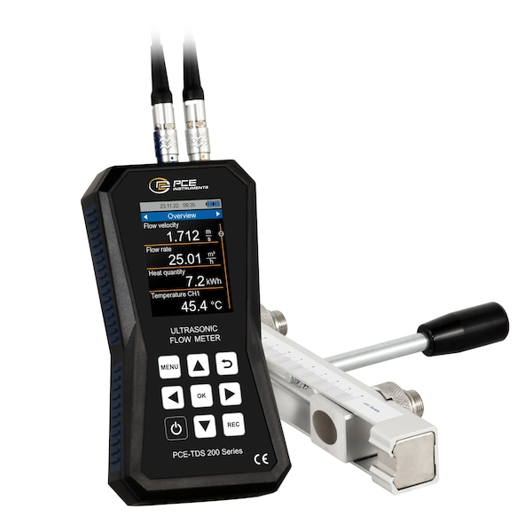 The ultrasonic flowmeter has a measuring range of +/-32 m/s. With an accuracy of +/-1.5 % f.s. for a pipe diameter of DN ≥50, +/-3.5 % f.s. for a pipe diameter of DN <50 and a reproducibility of +/-0.5 % f.s., the ultrasonic flow meter is a particularly precise measuring device. An installation aid is available for installing the sensors of the ultrasonic flow meter. The installation aid graphically displays the signal quality of the ultrasonic flow meter. In addition, it is graphically displayed whether the sensors of the ultrasonic flow meter are positioned at the correct distance from each other. To carry out flow measurements with the ultrasonic flow meter, the flow velocity, the volume flow and the volume are displayed after entering the pipe and medium specifications. The ultrasonic flow meter displays the measured values in a wide range of units. For example: m3, l, gal, igl, mgl, cf, bal, ib and ob. During a measurement, it is possible to record the measured values via the data logger function of the ultrasonic flow meter. Start and stop conditions and the storage interval can be set from 1 second to 12 hours for the ultrasonic flow meter. A memory point of the ultrasonic flow meter contains all measured values once. The measured values are stored on the 32 GB built-in memory of the ultrasonic flow meter. 10 million measuring points can be stored on the ultrasonic flow meter. With the optional software, the recorded measured values can be read out from the ultrasonic flow meter. For analysis, the measured values from the ultrasonic flow meter can be displayed in tabular and graphic form. For further processing of the measured values from the ultrasonic flow meter, they can be exported in .csv file format. Alternatively, a PDF report can be created via the software. For simplified operation, the ultrasonic flow meter can be set via the software. A live view of the measured values from the ultrasonic flow meter is also possible with the software. In order to determine the amount of heat with the ultrasonic flow meter, two additional thermocouples are required. These are available with the PCE-TDS 200+. The two thermocouples of the ultrasonic flow meter are connected to the flow and return of a pipe system. Based on the temperature difference and the measured flow rate, the ultrasonic flow meter can determine the amount of heat. If required, the ultrasonic flow meter can calculate and display the costs per heat quantity unit simultaneously during the measurement. Thus, the ultrasonic flow meter is used, for example, in the inspection of heating systems. The LC colour display of the ultrasonic flow meter has a size of 2.8" and is therefore easy to read. Optionally, the ultrasonic flow meter can be equipped with an ISO or DAkkS calibration certificate. PCE-TDS 200 SR SENSOR Connected on rail sensors for pipe sizes DN 15 ... 100 / 20 ... 108 mm. Both sensors are located on one rail to simplify the positioning of the sensors. For easier handling there is a handle on the rail. Magnets are located underneath the rails to enable them to hold on to pipes with ferrous metal by themselves.