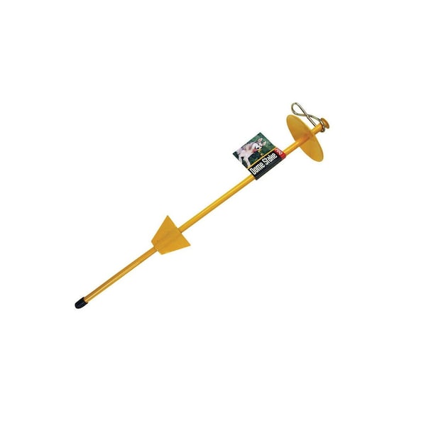 Made with a single piece of solid forged heavy-duty steel. Secures deep into the ground for security. Provides 360 Degrees of roaming freedom. Bright yellow color is easy to spot in the grass.