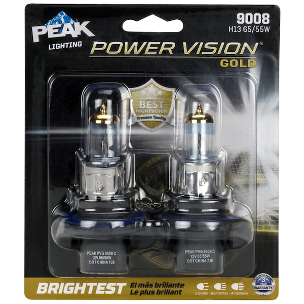 The Peak Power Vision Gold Headlamps feature high-performance tungsten filaments and customized gas mixtures combined with a proprietary optical coating. Safe driving at night is critical and it starts with your headlights. The sooner you’re able to see an object on the road the quicker you can react. Make sure your headlights are performing correctly and be sure to replace them with a high-performance headlights for increased visibility.