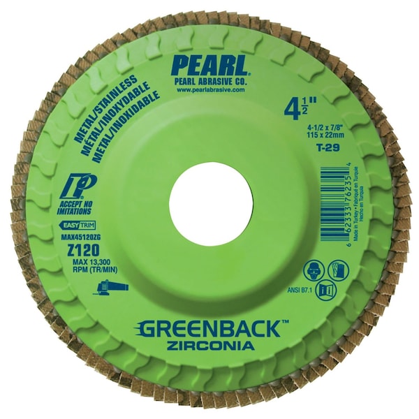 The GREENBACK MAXIDISC is a premium, trimmable flap disc with a durable nylon backer and aggressive zirconia abrasive. Trimming the GREENBACK is easy and it extends the life of the abrasive disc by replacing the worn outer edge of the tool with fresh abrasive material. The GREENBACK is available with a standard 7/8'' arbor or the fast and easy to use Quickmount backer that threads directly onto 5/8''-11 grinder spindles. -Nylon backer provides extra support and is easily trimmable, extending the life of the disc -Premium zirconia abrasive grinds quickly and has a long working life-Available Quickmount backer for fast and easy disc changes-Contaminate free
