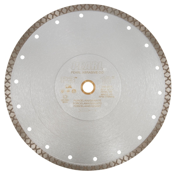 Pearl's P3 Turbo-X Thin Mesh Blade is ideal for cutting extra hard ceramics, porcelain and other hard/dense materials. Featuring an extra thin kerf and a reinforced inner core, the P3 Turbo-X cuts straight and cool for extended life._x000D_- Thin turbo-mesh rim and core for fast cutting and minimal chipping _x000D_- Reinforced inner core prevents flexing and provides straight cuts _x000D_- Ideal for cutting extra hard ceramics, porcelain and other hard/dense materials _x000D_- Extra long life _x000D_- 10mm Diamond rim _x000D_