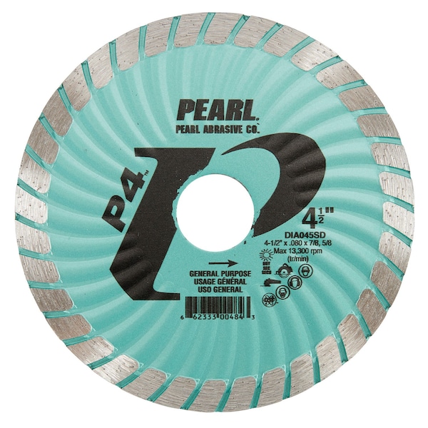 Pearl's SD Green P4 turbo blade features a waved core design which adds stability to the steel core, reduces friction, removes the debris from the cutting path and cools the blade, thus extending tool life. This durable blade cuts a wide variety of materials quickly and has a long life. The SD series can be used with circular saws, right angle grinders and more. It cuts concrete, reinforced concrete, marble, granite, brick, tile, and ceramics._x000D_- High diamond concentration for fast cutting with long life _x000D_- Waved core adds stability, clears debris and keeps the blade cool _x000D_- Large 8mm diamond rim _x000D_- Turbo rim for fast cut and minimal chipping _x000D_- Designed to be used on a variety of materials _x000D_- Wet or dry cutting _x000D_