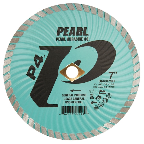 Pearl's SD Green P4 turbo blade features a waved core design which adds stability to the steel core, reduces friction, removes the debris from the cutting path and cools the blade, thus extending tool life. This durable blade cuts a wide variety of materials quickly and has a long life. The SD series can be used with circular saws, right angle grinders and more. It cuts concrete, reinforced concrete, marble, granite, brick, tile, and ceramics._x000D_- High diamond concentration for fast cutting with long life _x000D_- Waved core adds stability, clears debris and keeps the blade cool _x000D_- Large 8mm diamond rim _x000D_- Turbo rim for fast cut and minimal chipping _x000D_- Designed to be used on a variety of materials _x000D_- Wet or dry cutting _x000D_