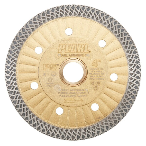 Pearl's P5 Thin Mesh Turbo is the industry's premier thin turbo blade. Utilizing a special ribbed inner core, the P5 provides excellent stability, preventing flexing and delivering straighter cuts. This core design also improves airflow, which removes debris faster and keeps the blade running cool. The diamond matrix and thin kerf design of the P5 were designed to cut hard and dense materials fast and with minimal chipping. Perfect for Porcelain, ceramic and natural stone materials.-Super-fast cutting with minimal chipping-Ribbed inner core prevents flexing and keeps the blade cooler-Ideal for cutting extra hard ceramics, porcelain and other hard/dense materials-10mm Diamond rim-Wet or dry cutting 10'' is Wet only