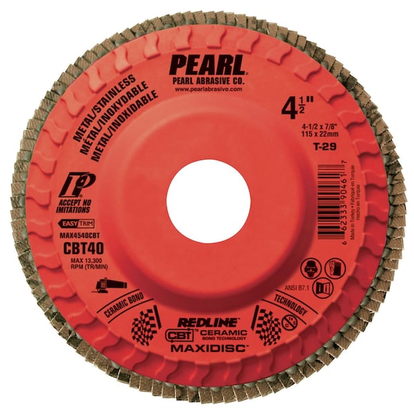 The Redline CBT MAXIDISC Trimmable is an ultra-premium disc with a non-fused ceramic abrasive and a trimmable nylon backer. CBT is extremely strong, aggressive, and self-sharpening. CBT delivers an unmatched working life and extremely aggressive stock removal. The Redline CBT Trimmable can be easily trimmed to further extend its working life. Available with a standard 7/8'' arbor or the fast and easy to use Quickmount backer, the Redline CBT is an ultra high-performance solution for professional users who demand the very best._x000D_- Faster stock removal than aluminum oxide or zirconia abrasives _x000D_- Extremely strong CBTTM abrasive out lasts aluminum oxide or zirconia abrasives _x000D_- Self-sharpening for high performance grinding throughout the life of the wheel _x000D_- Exceptional performance on stainless steel and other high tensile alloys _x000D_- Nylon backer provides extra support and is easily trimmable to extend the life of the disc _x000D_- Available QuickmountTM backer for fast and easy disc changes _x000D_- Contaminate free _x000D_