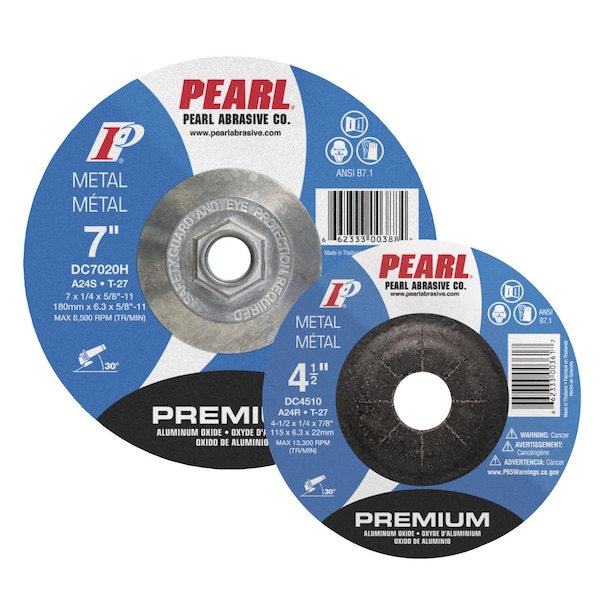 Premium series depressed center grinding wheels use premium abrasive grain and bond materials to step up cutting speed and wheel life for professional grade performance. The Premium is available as a standard grinding wheel or as a Pipeline style, combination cutting and light grinding wheel.-Premium aluminum oxide abrasive grain cuts faster and lasts longer-High quality resin bond balances cutting speed and tool life -Also available as a pipeline style combination cutting and light grinding wheel