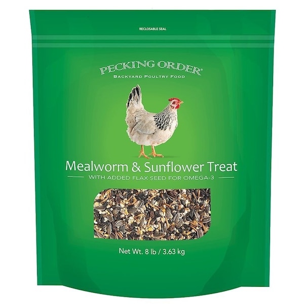 Pecking Order's mealworm and sunflower treat provides the right combination of quality ingredients to give your flock a tasty treat with benefits It all starts with nutrient rich sunflower seeds which provide healthy oils and antioxidants and you'll find plenty of seeds inside every bag Look down the ingredient list and you'll find more flock favorites like high protein dried mealworms, cracked corn, peanuts and raisins With Omega3 rich flax seed, added calcium and vitamin A and D3, your flock will enjoy an incredible variety of ingredients while getting all the benefits of a carefully crafted treat Offering mealworm and sunflower treat is a great way to interact with chickens and helps flock owners discover and enjoy the unique characteristics of each hen Treats can also be effectively used on a routine basis to bring your flock in close for a quick visual inspection to evaluate their wellbeing