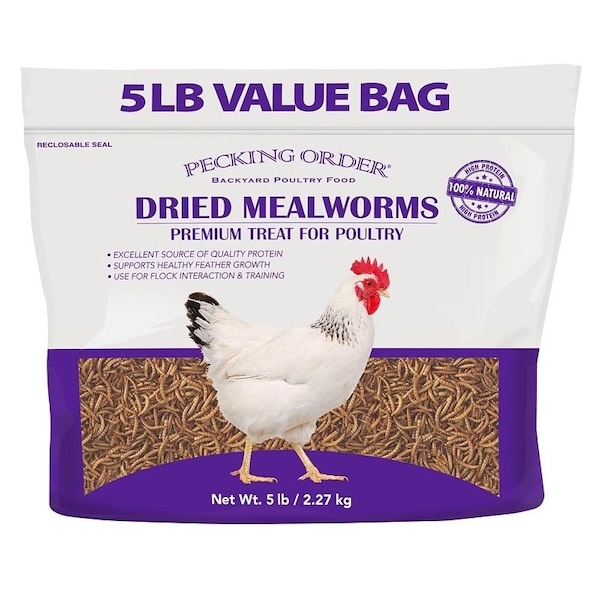 Pecking Order Dried Mealworms provide chickens and other poultry the irresistible high protein treat they love to eat Offer dried mealworms before, during and after a molt to support feather growth or simply feed as a treat while interacting with your flock What makes our dried mealworms extra special are the people that pack and prepare every bag of Pecking Order Our team carefully inspects the mealworms at one of our US based packing facilities before being placed inside a Pecking Order bag Try Pecking Order brand dried mealworms and feel confident you're giving your flock the very best Offering Dried Mealworms is a great way to interact with chickens and helps flock owners discover and enjoy the unique characteristics of each hen Treats can also be effectively used on a routine basis to bring your flock in close for a quick visual inspection to evaluate their wellbeing