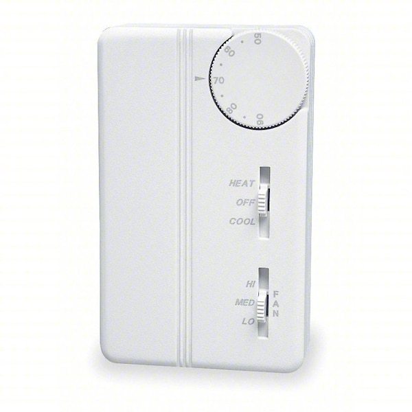 Fan Coil Thermostat, Electric Line Voltage, Electric Low Voltage, Thermostat Switch Type SPDT, Switch Action Open/Close on Rise, Number of Switches 1, Thermostat Control Range 50 Degrees to 90 Degrees F, Differential (Deg. F) 3, Thermostat Heating/Cooling Heating/Cooling, Thermostat Number of Pipes 4, Thermostat Number of Speeds 3, Fan Switching Hi-Med-Low, System Switching Heat-Off-Cool, Sensor Type Bi-Metal, 4 1/2 in, Sensing Bulb Dia. (In.) -, 2 7/8 in, Sensing Bulb Length (In.) -, 1 1/16 in