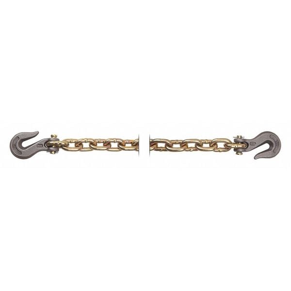 Straight Chain, Chain Type Transport Chain, Material Carbon Steel, Lifting Capability Not for Lifting, Working Load Limit 6,600 lb, Chain Grade 70, Trade Size 3/8 in, Link Inside Length 1 3/8 in, Link Type Straight, Link Inside Width 5/8 in, Overall Length 20 ft, Links per Foot 9, Compatible Fitting Thickness 3/8 in, Includes Hook Hook Included, Hook Type Included Grab Hook, Finish Gold Chromate, Material Thickness 25/64 in, Weight per Foot 1.38 lb, Welding Type Welded, Standards NACM