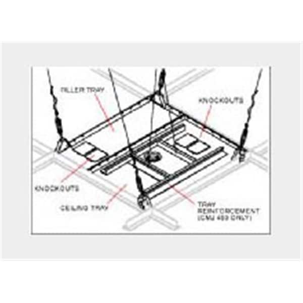 The Suspended Ceiling Plate for Jumbo Mounts consists of an 8 203mm x 24 610mm filler tray and a 15.75 400mm x 24 610mm ceiling tray suspended by four tie wires from the true ceiling above. A fifth safety cable is also provided. Turnbuckles allow the installation to be fine tuned. The 1 1/2-11.5 NPS threaded fitting in the ceiling tray serves as the point of attachment for a Peerless Jumbo TV Mount or other Peerless product specified as compatible with the Two Piece Suspended Ceiling Kit. Product may be attached directly or lowered with the addition of a Peerless 1 1/2-11.5 NPT Extension Column available in several lengths. 20 6.1m of tie wire is provided 12 gauge annealed steel soft black - enough for a 3 drop suspended ceiling. If the suspended ceiling is more than 3 feet from the true ceiling the installer will need to obtain additional wire prior to installation. Variable position Suspended Ceiling Kit