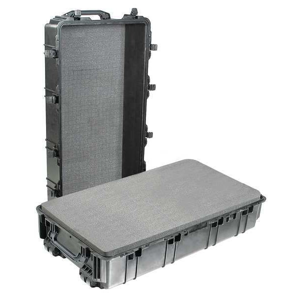 Protective Case, Bottom Depth 7 1/4 in, Closure Type Double Throw, Color Black, Electrostatic Discharge Not Electrostatic Discharge Conductive, Foam Design Convoluted, Pick and Pluck, Solid, Handle Style Folding, Includes Foam Insert Foam Insert Included, Inside Depth 14 7/8 in, Inside Length 41 1/8 in, Inside Width 21 1/2 in, Lid Depth 7 5/8 in, Material Plastic, Maximum Operating Temperature 210 Degrees F, Minimum Operating Temperature -40 Degrees F, Number of Latches 6, Number of Wheels 4