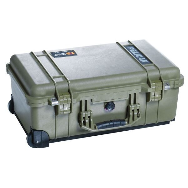Laptop Overnight Hardback Case w/ Wheels, Fits 14 in Laptops, Color Olive Drab Green, Material Polypropylene, Length 22 in, Width 13 3/4 in, Depth 9 in, Includes Detachable Computer Sleeve and Accessories Pouch, Retractable Extension Handle, (2) Polyurethane Wheels