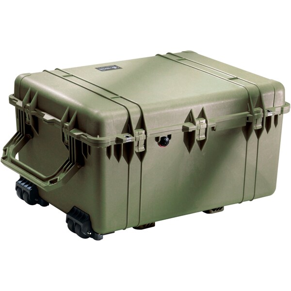 Protective Case, Bottom Depth 12 9/64 in, Color Olive Drab Green, Inside Depth 15 1/2 in, Inside Length 27 45/64 in, Inside Width 20 63/64 in, Lid Depth 3 1/4 in, Material Copolymer Polypropylene, Number of Wheels 4, Overall Depth 17 1/2 in, Overall Length 31 1/4 in, Overall Width 24 1/4 in, Standards IP67 (1m Submersion for 30 min), Def Stan 81-41/STANAG 4280, Weight 36 lb