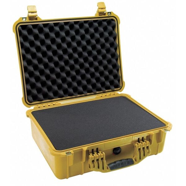 Protective Case, Bottom Depth 5 in, Closure Type Double Throw, Color Yellow, Electrostatic Discharge Not Electrostatic Discharge Conductive, Foam Design Convoluted, Pick and Pluck, Solid, Handle Style Folding, Includes Foam Insert Foam Insert Included, Inside Depth 6 3/4 in, Inside Length 18 in, Inside Width 12 7/8 in, Lid Depth 1 3/4 in, Material Plastic, Maximum Operating Temperature 210 Degrees F, Minimum Operating Temperature -40 Degrees F, Number of Latches 2, Number of Wheels 0