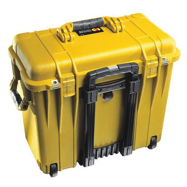 Protective Case, Bottom Depth 14 in, Color Yellow, Inside Depth 16 in, Inside Length 17 7/64 in, Inside Width 7 1/2 in, Lid Depth 2 in, Material Copolymer Polypropylene, Number of Wheels 2, Overall Depth 18 in, Overall Length 19 3/4 in, Overall Width 12 in, Standards IP67 (1m Submersion for 30 min), Def Stan 81-41/STANAG 4280, Weight 14.5 lb, Foam Material None