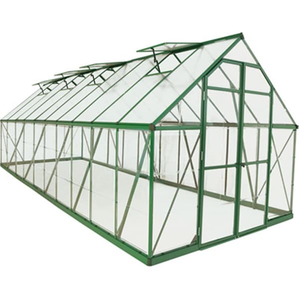 The Palram Bella Hobby Greenhouse offers 64 sq. ft. of growing space plus advanced light management to give you a healthy head start on your growing season. 8ft.L x 8ft.W durable aluminum bell-shaped frame adds an elegant look to your backyard while reducing wind impact and snow buildup. Has 86.1in. of headroom in the center. Features Durable, light-diffusing roof structure with virtually unbreakable twin-wall polycarbonate panels 90% light transmission for advanced light management Excellent heat retaining ability Panels block 99.9% of harmful solar UV radiation 4 adjustable roof vents help to moderate airflow and temperature to maximize growing conditions Includes integrated rain gutters to channel water for sustainable irrigation Lockable door handle provides security Galvanized steel base lends structural support that can withstand winds up to 60 mph when incorporated with the anchoring kit Maintenance-free design Handles snow loads up to 16 lbs./sq. ft. Specifications Product Type: Greenhouses Product Style: Peak Center Height in.: 91 Dimensions L x W ft.: 20 x 8 Outer Material: Polycarbonate Length in.: 240 Width in.: 96 Side Wall Height in.: 48.8 Frame Type: Aluminum Frame Spacing in.: 24 Glazing: Twin-wall polycarbonate roof with clear polycarbonate side panels Color: Green frame