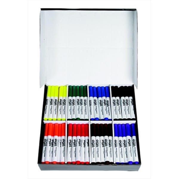 Conical Tip Washable Marker Classroom Pack includes 200 Non-Toxic markers that has ink that washes off easily from skin and many fabrics. It comes with 25 markers each of black red blue green yellow purple orange and brown assorted colors.
