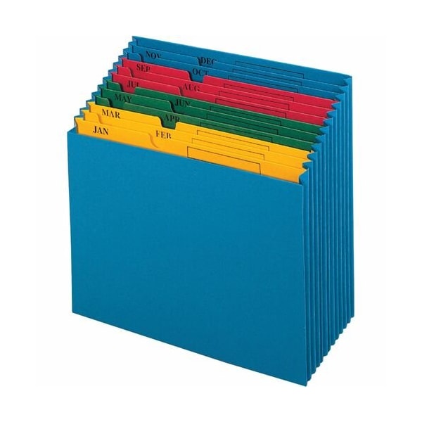 QuickVue Project File keeps daily projects within reach. Unique graduated indexes provide easy access to frequently used files. Stair-step design shows preprinted, double-top indexes at a glance. Four separate index colors provide a unique, color-based filing system. 12 letter-size pockets are labeled monthly from January to December. Store desktop file neatly in overhead binder bins or bookshelves.