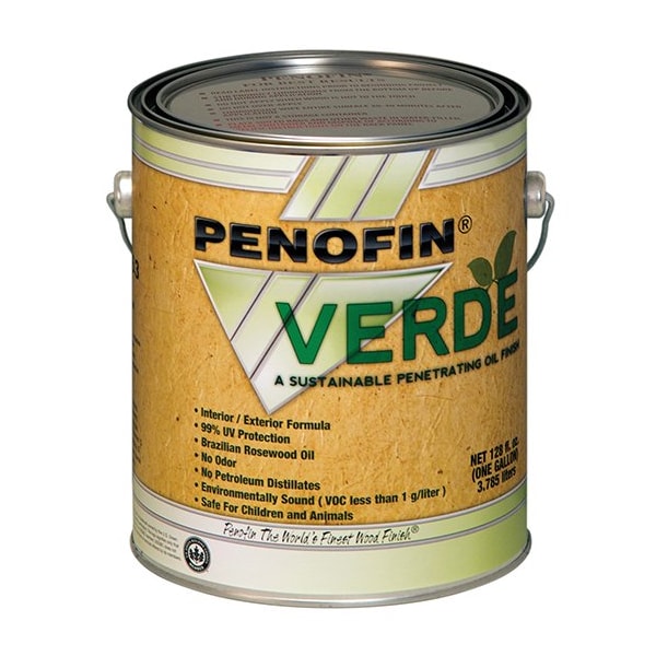 Verde is a 0-VOC finish that can be used in both interior and exterior applications. It is made with new age vegetable ester solvents, tough plant based resins, and the same high quality Brazilian rosewood oil found in all of our fine Penofin products. A sustainable penetrating oil-based finish. 0 VOC, environmentally friendly, safe for use around children and animals. Indoor/outdoor formula offers 99% UV protection with no odor and no petroleum distillates. Covers 250-400 sq ft per gallon.