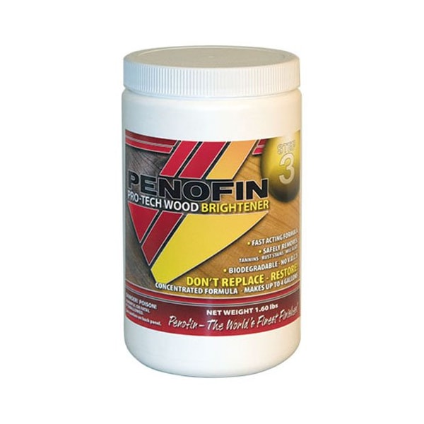 Annihilates tough tannin stains and watermarks on all types of wood, decking, siding and fences; removes mill glaze. Penofin Pro-Tech Brightener re-establishes the Ph balance of your wood after stripping and cleaning and brightens gray weathered wood to bring back that mill-bright color. Roughly 300-400 square feet depending on surface type.