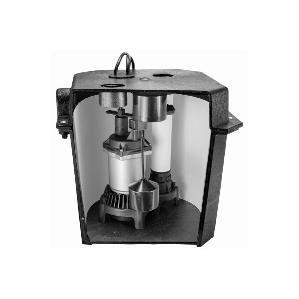 Simer 6 gallon tank laundry system Use for any flood discharge of liquids such as under laundry tub, remodeling wet bar, humidifier, or sink draining with overload protection Piggyback vertical float switch for manual or automatic operation Easy installation eliminates need for expensive plumbing renovation This pump has a thermoplastic body, check valve, grommets and fittings 14 HP motor, compact design, 1525 x 1525 x 135 tank 112 in inlet, discharge and vent Performance GPH At 0' 3200, 5' 2700, 10' 2160, 15' 1500