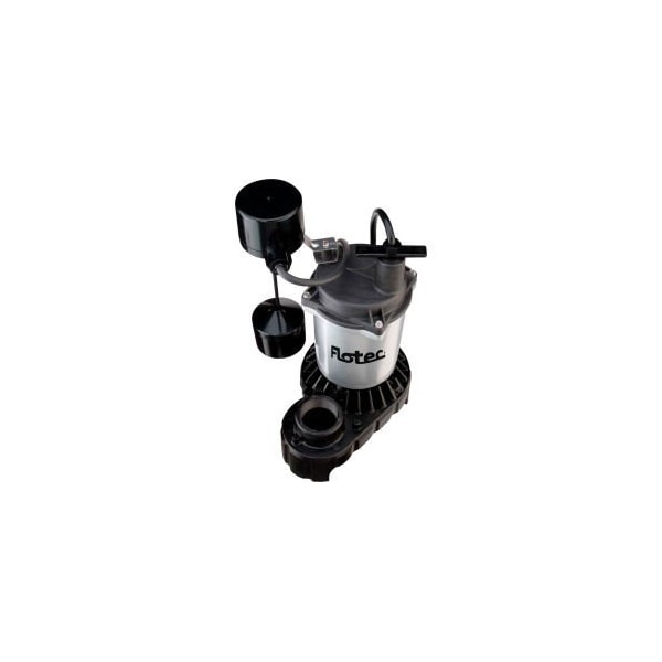 FLOTEC SUBMERSIBLE CAST IRON AND ZINC SUMP PUMP 1/3 HP RUGGED CAST IRON BASE AND CORROSION-RESISTANT ZINC BODY FOR HEAVY DUTY APPLICATIONS WITH AN ENERGY-EFFICIENT MOTOR THAT IS THERMALLY PROTECTED AGAINST OVERLOAD. VERTICAL ON/OFF FLOAT SWITCH CAN BE USED IN SMALLER SUMP BASINS. KEY FEATURES: