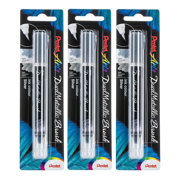 The DualMetallic Brush Pen features innovative reflective and sparkling iridescent ink that is ultra-glittery. The ink looks like different colors when drawing on black or white paper, and is ideal for cards, invitations, drawing, doodles, and other designs. The durable nylon brush holds its shape, and the push plunger provides the ink flow. Sold as a pack of 3.
