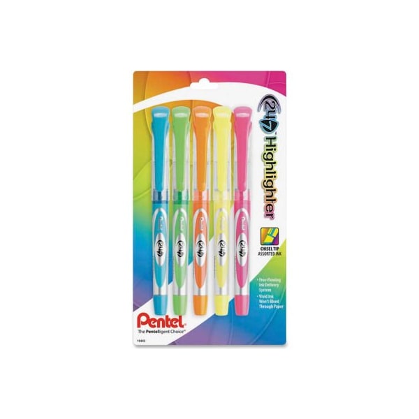 Pentel 24/7 highlighter, chisel tip, yellow/pink/blue/green/orange ink, 5/pack multipurpose highlighters deliver a free-flowing ink for smooth, even coverage. Chisel tip highlights thick or thin lines. Vivid ink won't bleed through most papers. Works on faxes, photocopies, computer printouts and more. Perfect for highlighting, underlining and color-coding. Certified ap nontoxic by acmi. Bleed resistant ink. this product arrives to most customers in 2-3 business days.