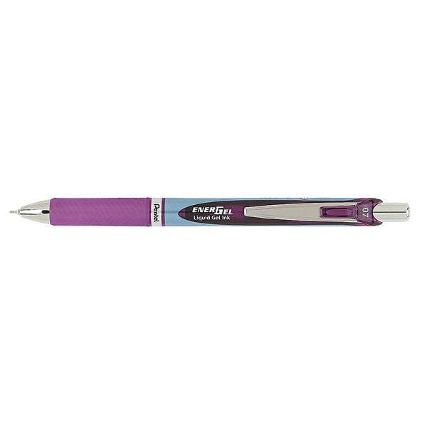 Rollerball Pen, Pen Tip 0.7 mm, Barrel Material Plastic, Barrel Color Gray, Purple, Pen Grip Cushioned, Pen Cap Retractable, Includes Pen Cushion Cushion Included, Pen Ink Color Purple, Series EnerGel(R) RTX