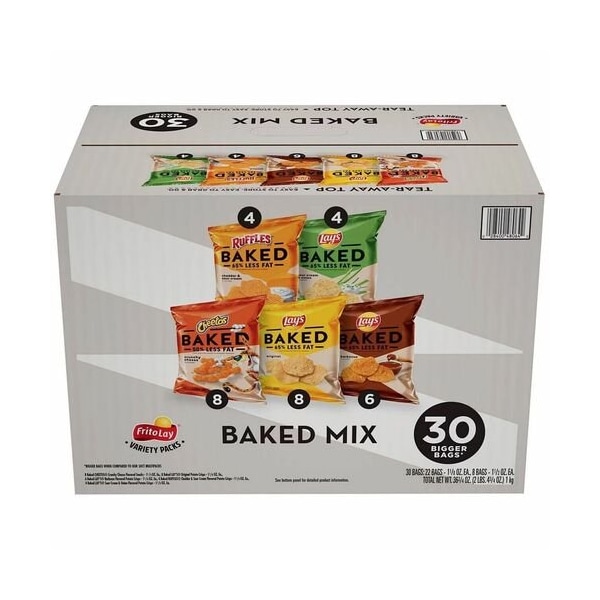 Fun variety of baked snacks makes this collection a smart mix. These small bags 1-1/8 oz. or 1-1/2 oz. are a great alternative for lunch boxes and snack-time. Baked snacks are baked, not fried, to give you the great taste you've come to love with Frito-Lay snacks. Baked snacks also offer less fat than regular potato chips, cheese-flavored snacks and tortilla chips. Baked Mix includes Ruffles Baked Cheddar & Sour Cream Flavored Potato Crisps, Lay's Baked Sour Cream & Onion Flavored Potato Crisps. Lay's Baked Original Potato Crisps, Cheetos Baked Crunchy Cheese Flavored Snacks, Lay's Baked Barbecue Flavored Potato Crisps.