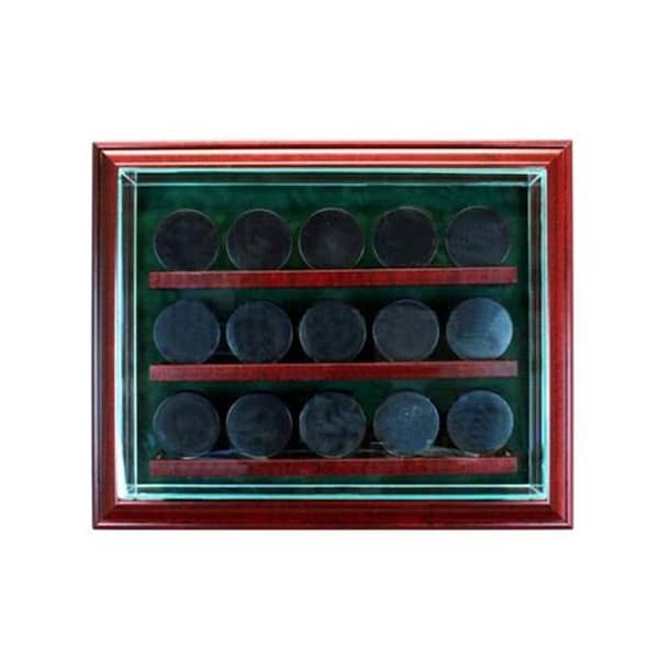 - This 15 Hockey Puck case has 3 shelves that hold 5 pucks each.