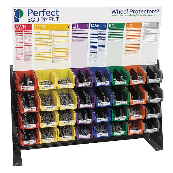 Wheel Weight Assorment, Material Lead, Number of Pieces 1325, Special Features Comes Complete With A Tabletop Rack With Ample Storage Space For The Perfect Equipment Invented, Color-Coded Bins To Make Weight Identification Quick And Easy, OE Alloy Universal Header Card, Universal Bin Lable Kit, 75K Alloy Soft-Head Wheel Weight Hammer, 18027 OE Alloy Application Wall Chart, 18082 OE Alloy Application Guide, RGP1 Two Passenger Car Rim Gauges