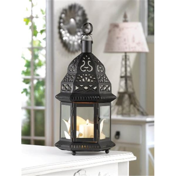 Starlight patterns glow from each cutout of this ornate metalwork candle lantern! Traditional Moroccan styling adds a classic exotic look to any garden setting. Features -Made of Iron and glass. -Dimension - 5 x 6 x 12.5 in. -Item Weight - 1.2 lbs.