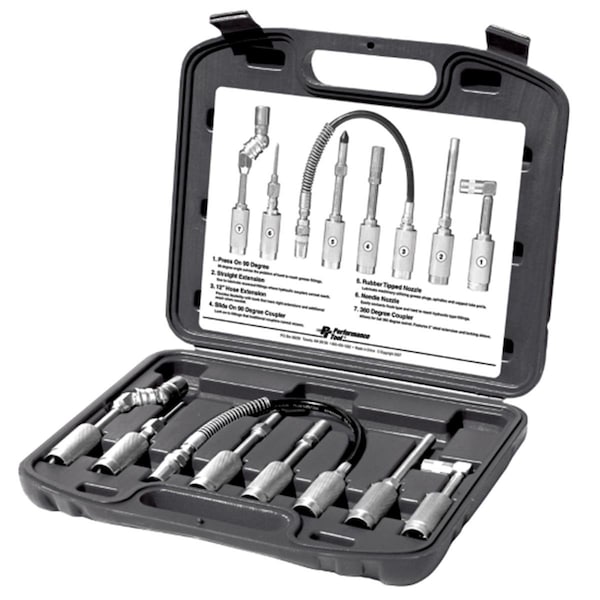 FeaturesFor all types of grease lubrication applications. 1 press on 90 degree angle tip. One straight extension tip. One 12 in. hose extension. One slide on 90 degree coupler. One rubber tipped nozzle. One needle nozzle. One 360 degree coupler.
