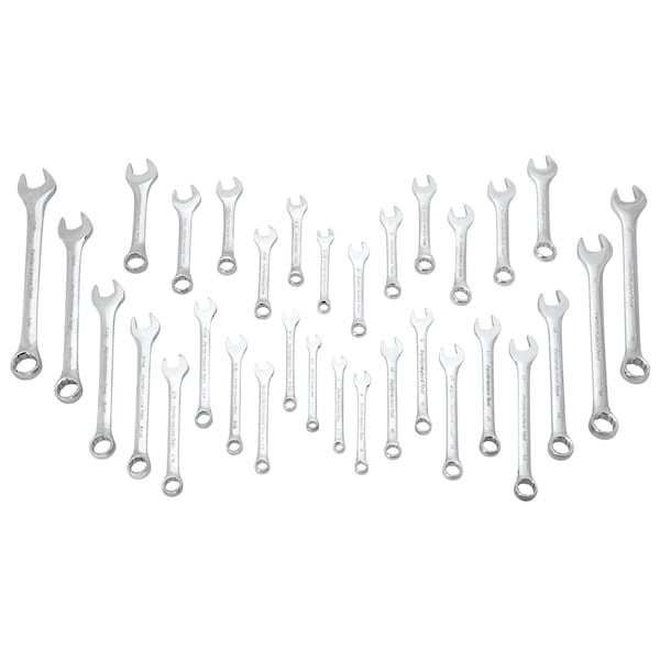 Combination And Stubby; 1/4 Inch/ 5/16 Inch/ 3/8 Inch/ 7/16 Inch/ 1/2 Inch/ 9/16 Inch/ 5/8 Inch/ 11/16 Inch/ 3/4 Inch/ 6 Millimeter/ 7 Millimeter/ 8 Millimeter/ 9 Millimeter/ 10 Millimeter/ 11 Millimeter/ 12 Millimeter/ 13 Millimeter/ 14 Millimeter/ 17 Millimeter/ 18 Millimeter Standard And 5/16 Inch/ 3/8 Inch/ 7/16 Inch/ 1/2 Inch/ 9/16 Inch/ 5/8 Inch/ 10 Millimeter/ 11 Millimeter/ 12 Millimeter/ 13 Millimeter/ 14 Millimeter/ 15 Millimeter Stubby Size; Polished; Chrome Vanadium Steel; Set Of 32; With Storage Rack