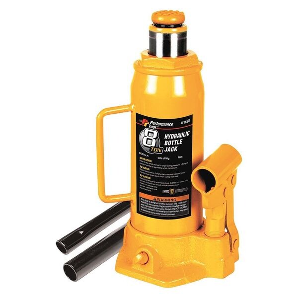 Hydraulic Bottle Jack,8 tons, Load Capacity 8 ton, Body Material Steel, Lifting Actuator Manual Handle, Minimum Lift Height 9 in, Maximum Lift Height 18 in, Power Source Mechanical, Base Length 4 3/32 in, Base Width 4 5/8 in, Features Adjustable Top Screws, Heavy Duty Base, Handle Type Folding Handle
