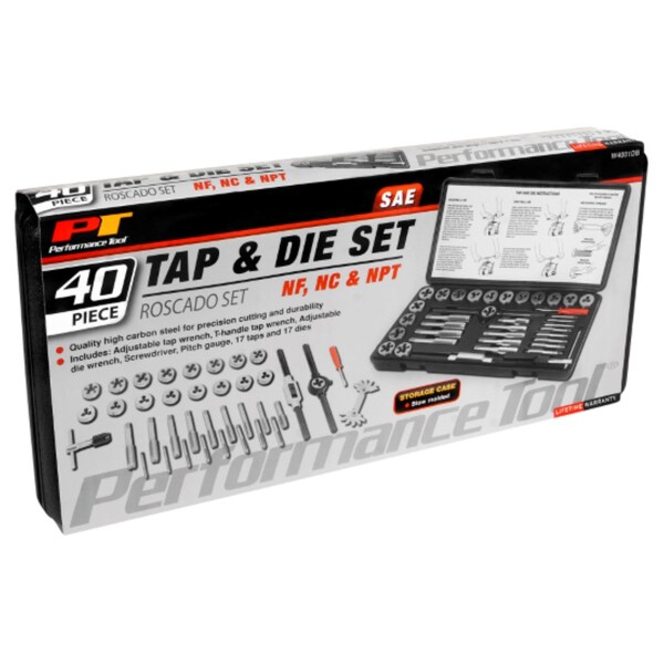 40-piece SAE Tap and Die Set by Performance Tool. This product is made of high-quality materials to serve you for years to come. Designed using state-of-the-art technology and with customers in mind. It will meet your needs and deliver great quality at an affordable cost.