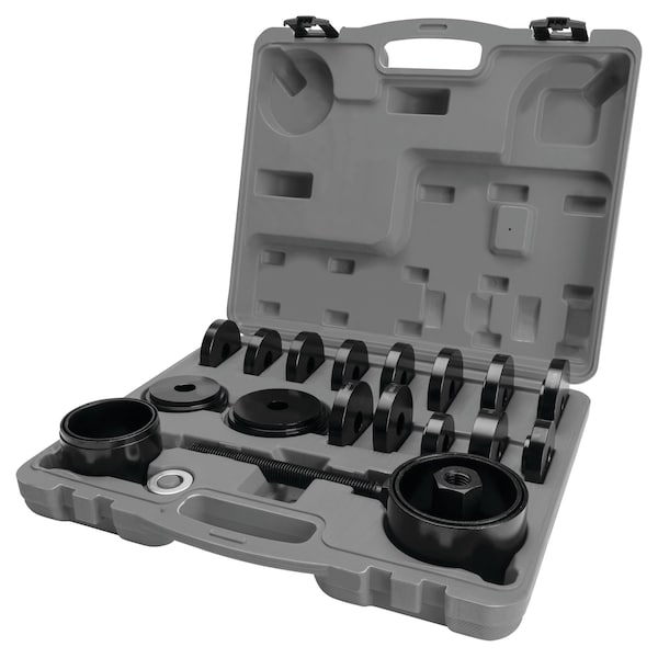 Wheel Bearing Service Set, Tool Type Bearing Service Set, Length 16 45/64 in, Width 3 51/64 in, Height 14 19/64 in, Spout Flex Size Not Applicable, Capacity Not Applicable, Material Steel, For Vehicle Tool Category Wheel Hub, Color Black, Includes Storage Case, Number of Pieces 23, Application Automotive, Telescoping Length Range Not Applicable, Weight Capacity Not Applicable, For Use With Wheel Bearings, Replace Wheel Bearings without Removing the Steering Knuckle and Strut Assembly