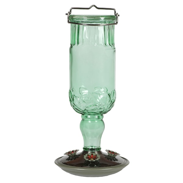With the Perky-Pet green antique glass bottle hummingbird feeder you’ll get a functional feeder that hummingbirds can’t resist, all in one show-stopping package. The attractive pale green antique-style bottle and the brushed metal base will make a stunning backyard accent piece that you’re sure to love. With 4 red flower-shaped feeding ports and a 24 oz. nectar capacity to ensure there’s enough to go around, your hummingbirds will love it too! Meanwhile, the all-metal and glass construction offers long-lasting durability. For easy cleaning, the feeder features a pop-apart base. Clean this feeder every week to keep your visiting hummingbirds happy and healthy.