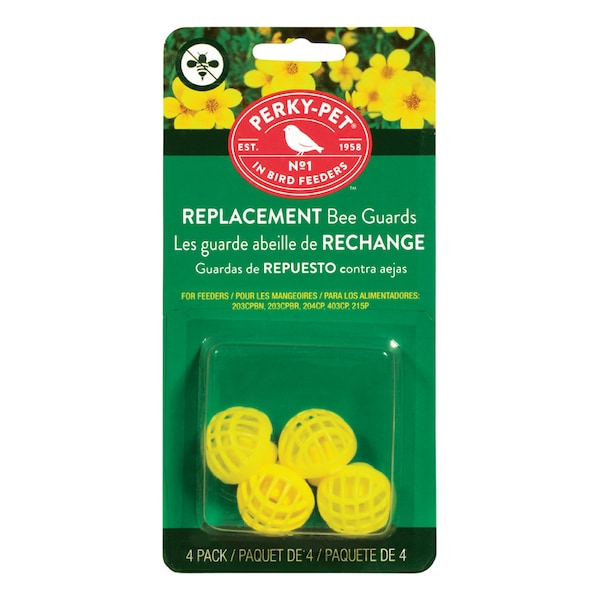 Perky-Pet Yellow Replacement Bee Guards are an economical convenient way to extend the life of your hummingbird feeders and keep them in perfect working order. These bee guards are compatible with Perky-Pet models 203CPBN 203CPBR 204CP-4 and 403CP. The raised cage around the port helps to keep bees out of nectar so your feeders are reserved just for the birds. For your convenience these bee guards are easy to install and snap open for easy cleaning. Contains 4 replacement bee guards per pack.