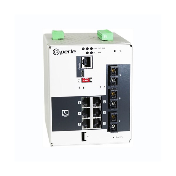 IDS-509G3PP6-C2MD05-SD10-XT Industrial Managed PoE Switch, 9 ports: 6 x 10/100/1000Base-T Base-T RJ-45 ports, all of which are PoE/PoE+ capable and 2 x 1000Base-SX, 850nm multimode port with duplex SC connector [ 550m/1804 ft ] and 1 x 1000Base-LX/LH, 1310nm single mode port with duplex SC connector [10 km/ 6.2 miles ]. -40 to 75C Industrial extended operating temperature. PRO software feature set.