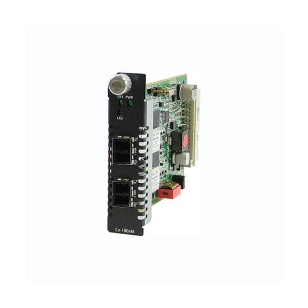 CM-100MM-M2LC2 Managed Fast Ethernet Fiber to Fiber Converter Module: 100BASE-FX 1310nm multimode (LC) [2 km/1.2 miles] to 100BASE-FX 1310nm multimode (LC) [2 km/1.2 miles]. Managed or unmanaged operation.
