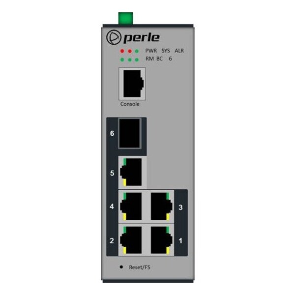 IDS-306 Industrial Managed Switch, 6 ports: 5 x 10/100/1000Base-T Base-T RJ-45 ports and 1 x 100/1000Base-X SFP slot (empty). -10 to 60C operating temperature. PRO software feature set.