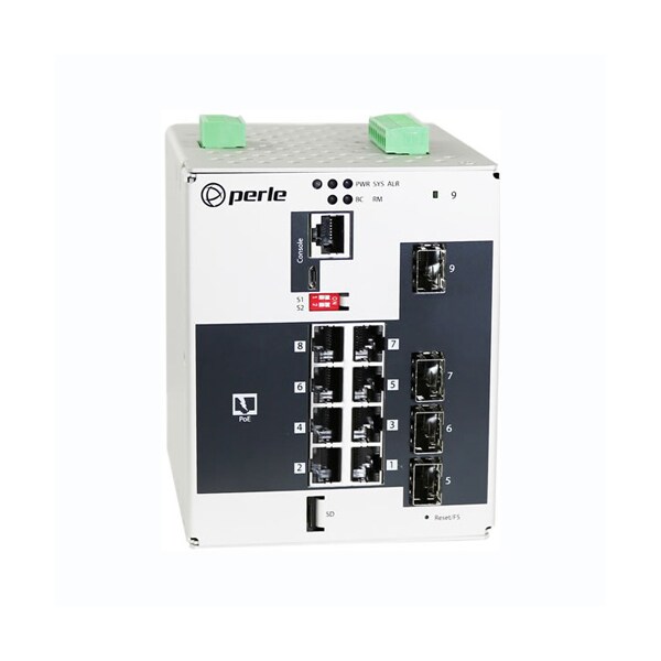 IDS-509CPP-XT Industrial Managed Switch, 9 ports: 8 x 10/100/1000Base-T Base-T RJ-45 ports, 8 of which are all PoE/PoE+ capable, 3 of which are (100 Mbps and 1 Gbps) dual-purpose Combo ports (SFP or RJ45 PoE) plus 1 x dedicated (100 and 1000 Gbps) SFP slot. -40 to 75C Industrial extended operating temperature. PRO software feature set.