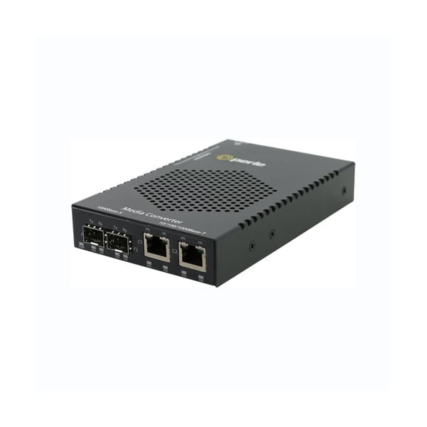 S-1110DHP-DSFP - Gigabit Media and Rate Converter with Type 4 High-Power PoE PSE (up to 100W/port): Dual 10/100/1000Base-T (RJ45) [100 m/328 ft] to 1000Base-X or 100Base-X. Dual SFP Slots (empty). Includes AC Power Adapter