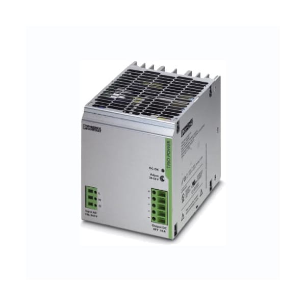 TRIO-PS/1AC/48DC/10 DIN Rail Power Supply: 48 VDC, 480 Watt with universal 85 to 264 VAC, 30 to 56V DC output range adjustable, -25 to 70C extended operating temperature.