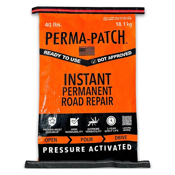 Cold Patch, Product Type Cold Patch, Base Material Limestone Asphalt Mix, Cure Type Pressure, Resistance Properties Weather Resistant, Product Form Solid, Container Size 40 lb, Container Type Bag, Coverage 4 sq ft @ 1 in, Maximum Crack Width Not Applicable, Maximum Thickness Not Applicable, Minimum Thickness 1/4 in, Maximum Traffic Hours Not Applicable, Application Highway, Loading Ramp, Parking Lot, Pothole, Road, and Sidewalk Repair