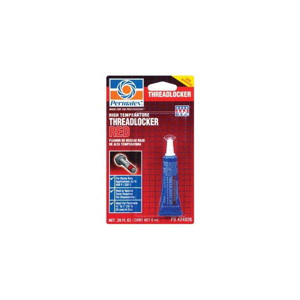 OEM specified. High temperature/high strength threadlocker for heavy-duty applications. Prevents bolts and press fits 3/8" to 1-1/2" (10mm to 38mm) from loosening due to shock, severe vibration and heat stress. Exclusive formulation for newer engines and high performance applications that require extreme temperature resistance. Suited for temperatures up to 450F (232C). Removable with heat and hand tools.