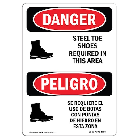 OSHA Sign, Steel Toe Shoes Required Area Bilingual, 24in X 18in Rigid Plastic, 18" W, 24" H, Spanish